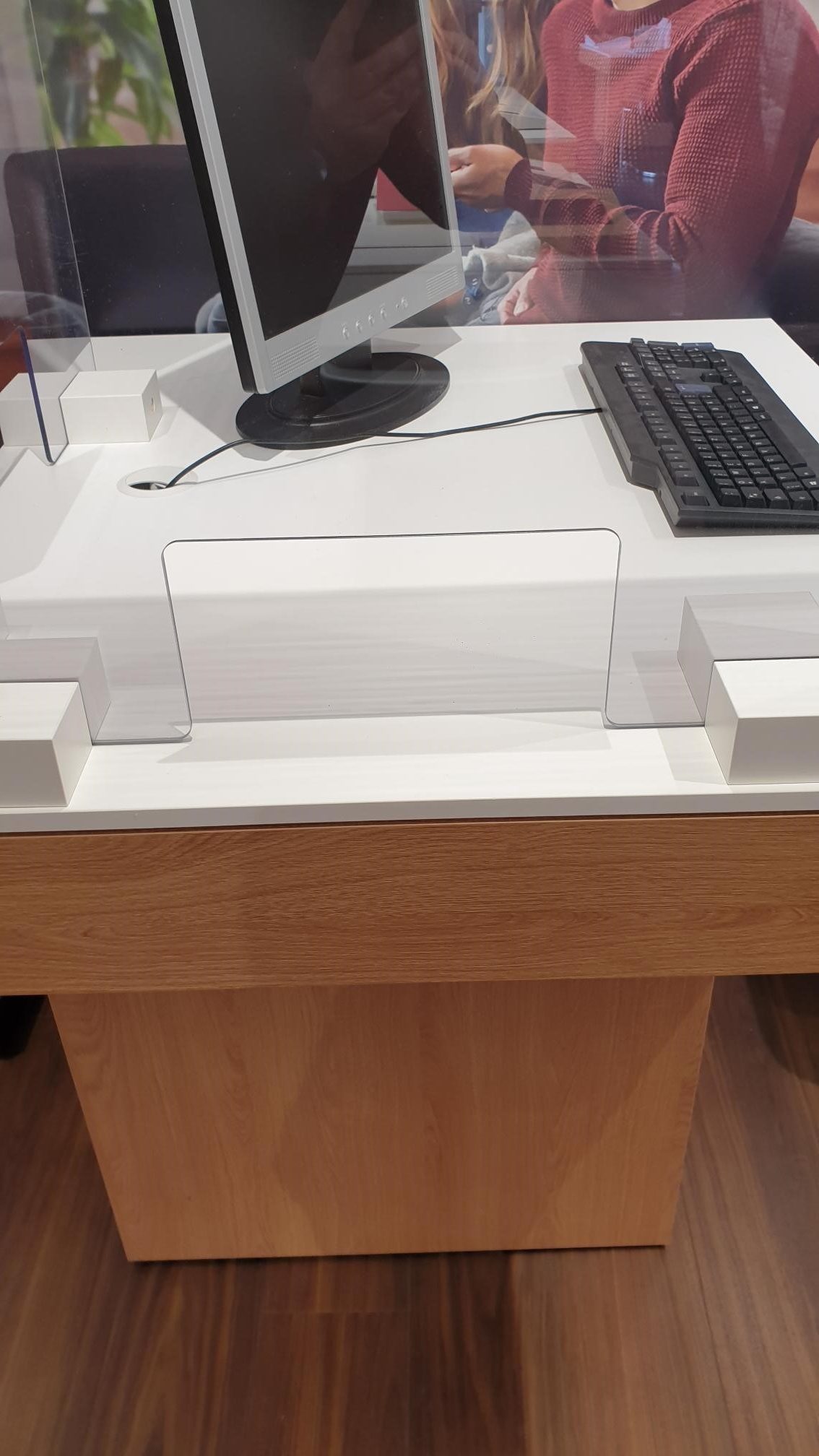 Plexiglasscheibe 650x700mm (BxH) mit Durchreiche; mit 2 Halteklötzen, weiß; mit Klebepads (rückstandslos entfernbar) zum Befestigen auf Beratertheken;
