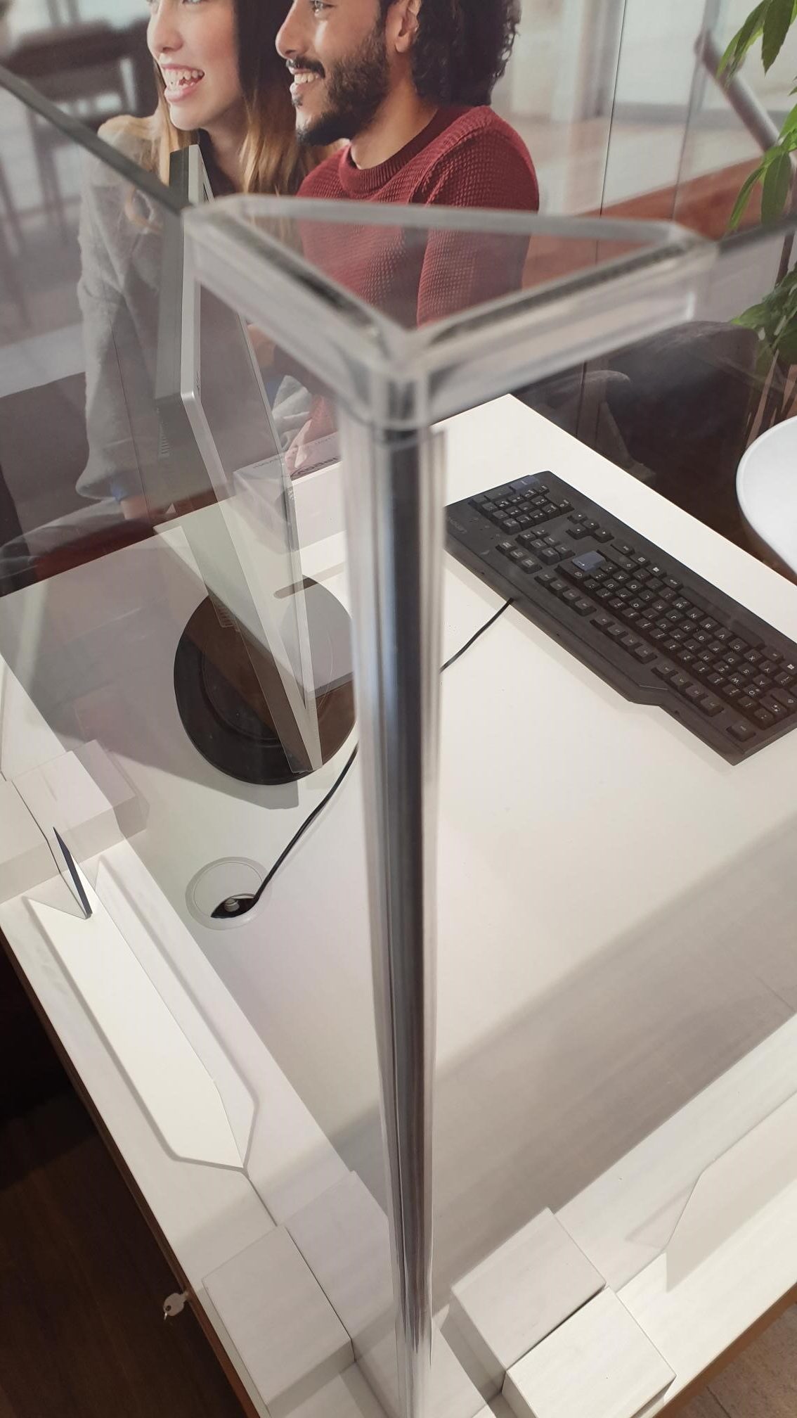 wird in Kombination mit dem zweiten mobilen Spuckschutz b im 90°-Winkel aufgestellt und auf der Arbeitstischplatte fixiert;